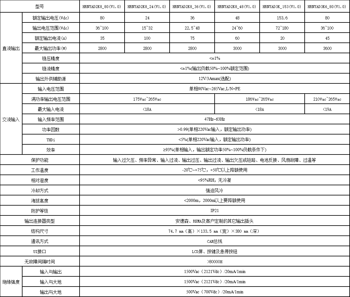 HRNYAD2K8_80(V1.0)系列充电机是适用于铅锂电池充电的手提便携式充电机,它适用于电网电压为单相220Vac的地区。它采用有源功率因素校正技术(PFC)加LLC谐振变换技术(DC/DC),采用DSP控制,具有输入过欠压保护、低压输入降功率保护、输出过欠压保护、输入输出过流保护、频率异常保护、功率元件过温保护、高温环境降载和过温保护、输出短路保护、电池接反保护和紧急停机保护等较完善的保护功能;充电机带液晶显示,充电基本参数可通过按键设定或查询;BMS或其它上位机也可通过CAN接口实现对充电机的遥信、遥测和遥控,具有高效率、低谐波、高可靠性、可视化和智能化等特点。